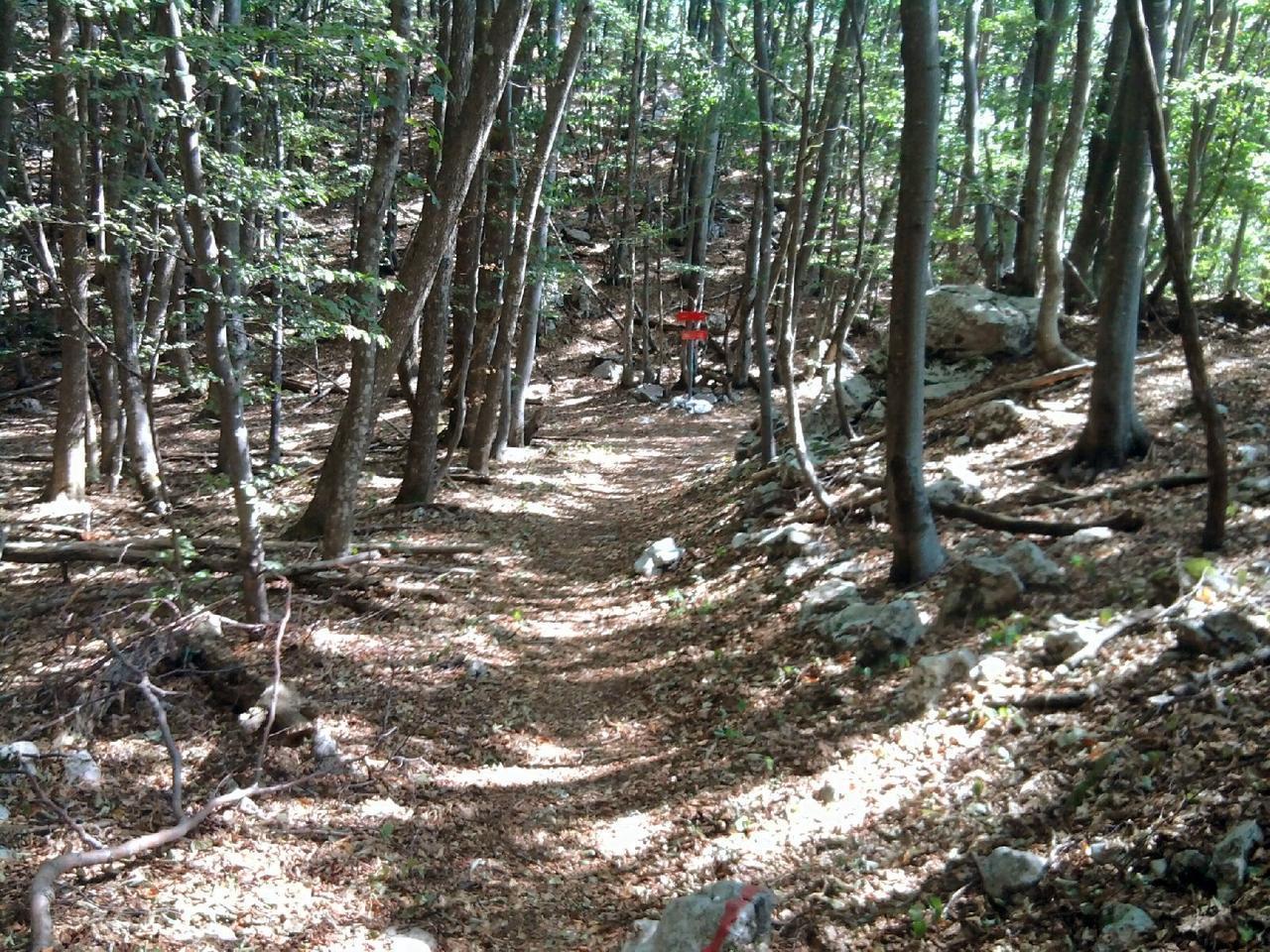 Do vrha sem potreboval skoraj dve uri. Privoščil sem si jabolčni zavitek, se malo odpočil in nadaljeval po peš poti proti Suhemu vrhu. Na začetku je pot zelo zaraščena z malinami, nato pa se začne strmo spuščati. Na poti je veliko skalovja in spust je postal tehnično zahtevnejši. Na srečo je trajalo samo približno 15 min in pot se je razširila, malo izravnala in postala uživaška. Še nekaj časa sem ji sledil in malo pred Suhim vrhom sem se znašel na lepi široki gozdni cesti, ki me je vodila skoraj v dolino.